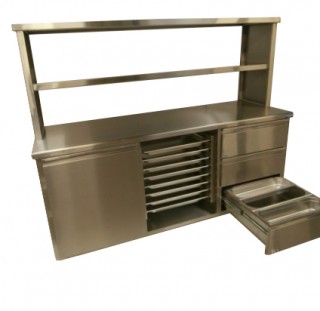 Работна маca – островна или крайстенна (със заден борд), с чекмеджета. Чекмеджетата са изработени от неръждаема стомана и стандартно са в размер с вместимост 1бр. GN1/1 съд. Могат да бъдат изработени и с нестандартен размер.