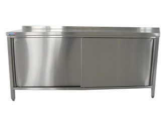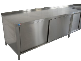 Неръждаем работен шкаф с плъзгащи врати, с или без междинен рафт. Системата за плъзгане на вратите е според най-високите световни стандарти в бранша. Допълнителни полиамидни ролки, вградени в дъното на вратите, се търкалят в студено формовани, заоблени улеи по долния плот. Системата придава максимална здравина и стабилност, при изключително лесно плъзгане и отговаря на най-високите изисквания за поддържане на хигиена. Шкафовете се изпълняват с каширан работен плот. При производството могат да се използват както крака тръба 40/40, така и кръгли неръждаеми крака ф 65 мм. Стандартната височина е 850мм, но могат да се изработват и шкафове високи до 2200 мм. Изпълняват се по размери, съобразени с нуждите на клиента с максимална дължина до 2900мм, като по-дългите шкафове са с повече от две плъзгащи врати.